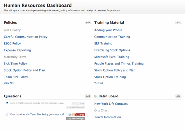 You can also give your employees a vehicle for asking questions using our q&a configuration. Capture the questions and answers in an area private to the HR team. Assign specific questions to subject-matter experts using tasks.
