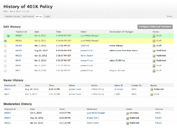 All modifications and activity is tracked in our moderation history. Moderation history even tells you when certain versions were published or unpublished. The ability to read Edit History is a permission, so you can also restrict this information to the core HR team.
