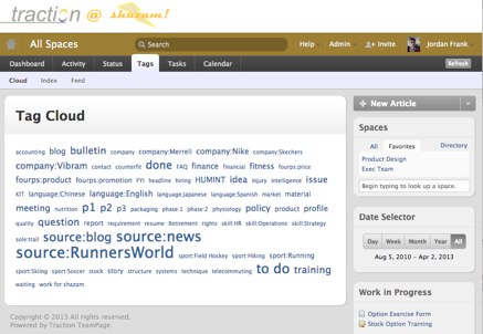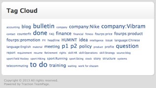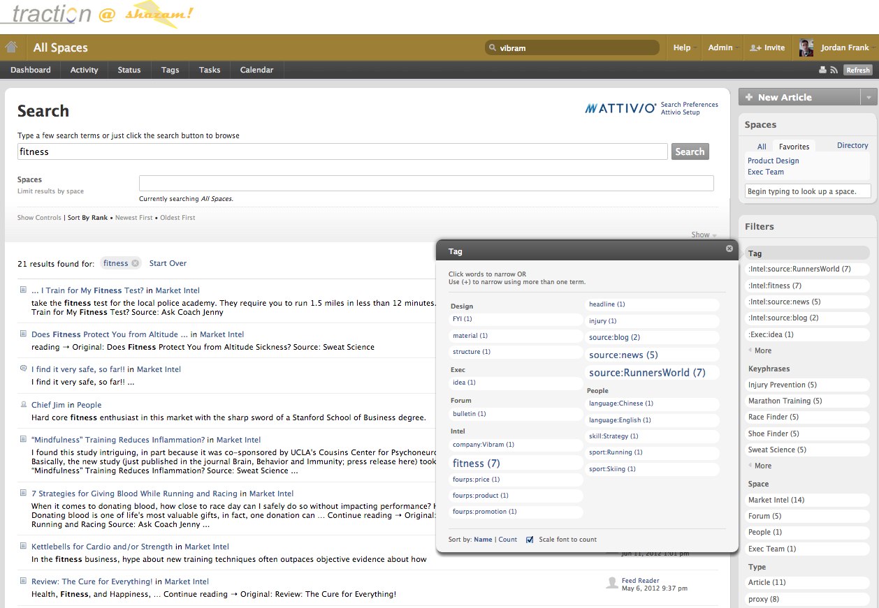 This sort of tag cloud view offers a pretty blunt view across a whole server or a particular space at a time. Greater precision is often required. Another way to slice the content is with our premium search which is powered by Attivio's Active Intelligence Engine. You can search for any set of words and get a tag cloud for the search, then even slice that into a time period or by any other facet or set of tags.