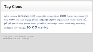Blog data in a TeamPage demo also offers a simple and easy example to explain the importance of thin slicing over long trends. Here is a tag cloud from one of my demo servers. It's set to All Time. The tags tell a story, of sorts. Interpret it as you may.