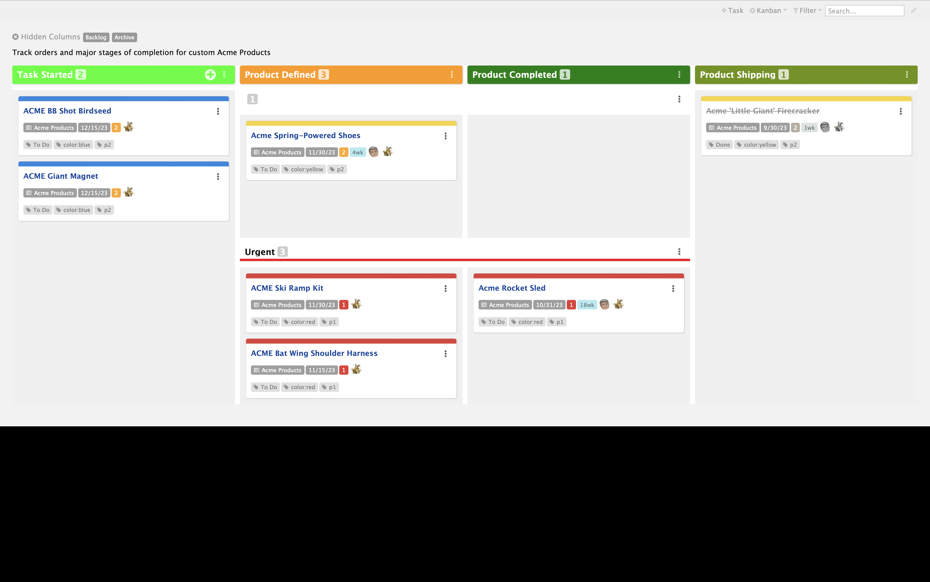 • In addition to showing and hiding the special built-in columns, such as 'End' and 'Archive', users can now show and hide normal columns and swimlanes as well. The Kanban action (gear) menu now includes a preference to show or hide 'hidden column badges' which list the names of all currently hidden columns and similarly for hidden swimlanes. By default, badges for hidden columns or swimlanes are shown. Clicking the badge of a hidden column or swimlane makes that column or swimlane visible and that badge disappears while its associated column or swimlane is shown. See 'Backlog' and 'Archive' badges in the upper left corner of the Kanban board in screenshot above.