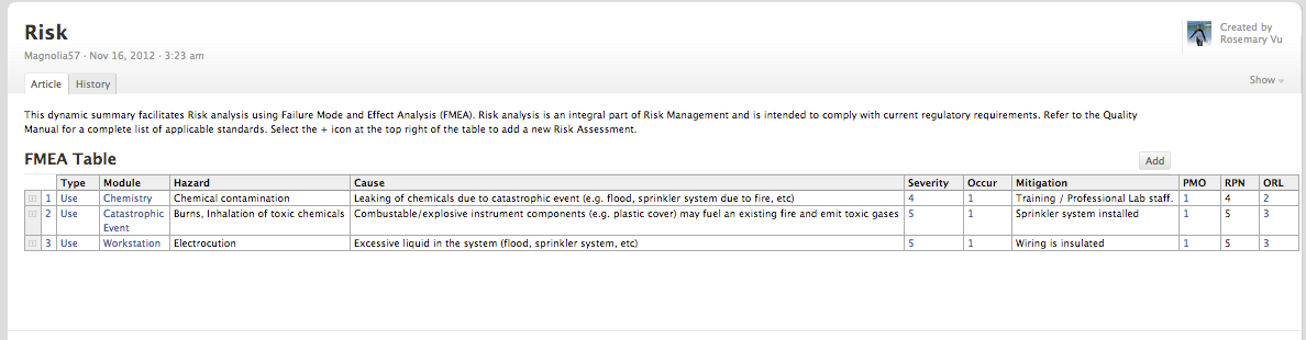 Risks are the leading cause of costly delays in the process of bringing a biotech product to market. Risk management in the product development process all too often means one person juggling a list of risks in a spreadsheet. It's hard to edit, but even harder to open a discussion on an existing risk when someone has a question, sees a problem, or wants to add a new risk. Traction® Software partner Rosemary Vu used Traction® TeamPage's Section Table widget and extended TeamPage's Article to create a Risk form. For more on TeamPage Section Tables, see Q: How do I link to an Excel file? A: Why Would you Do That?