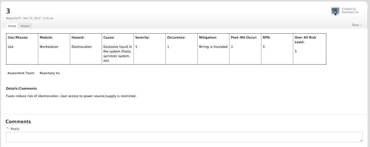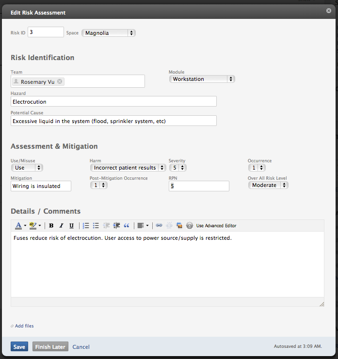 The TeamPage Risk form has fields, pulldowns and a free text description that makes it very easy to enter and edit. Risk values are formatted in a way that makes them easy to read when a Risk is shown as single Teampage article (below) as well as when a Risk is referenced in a Risk table.