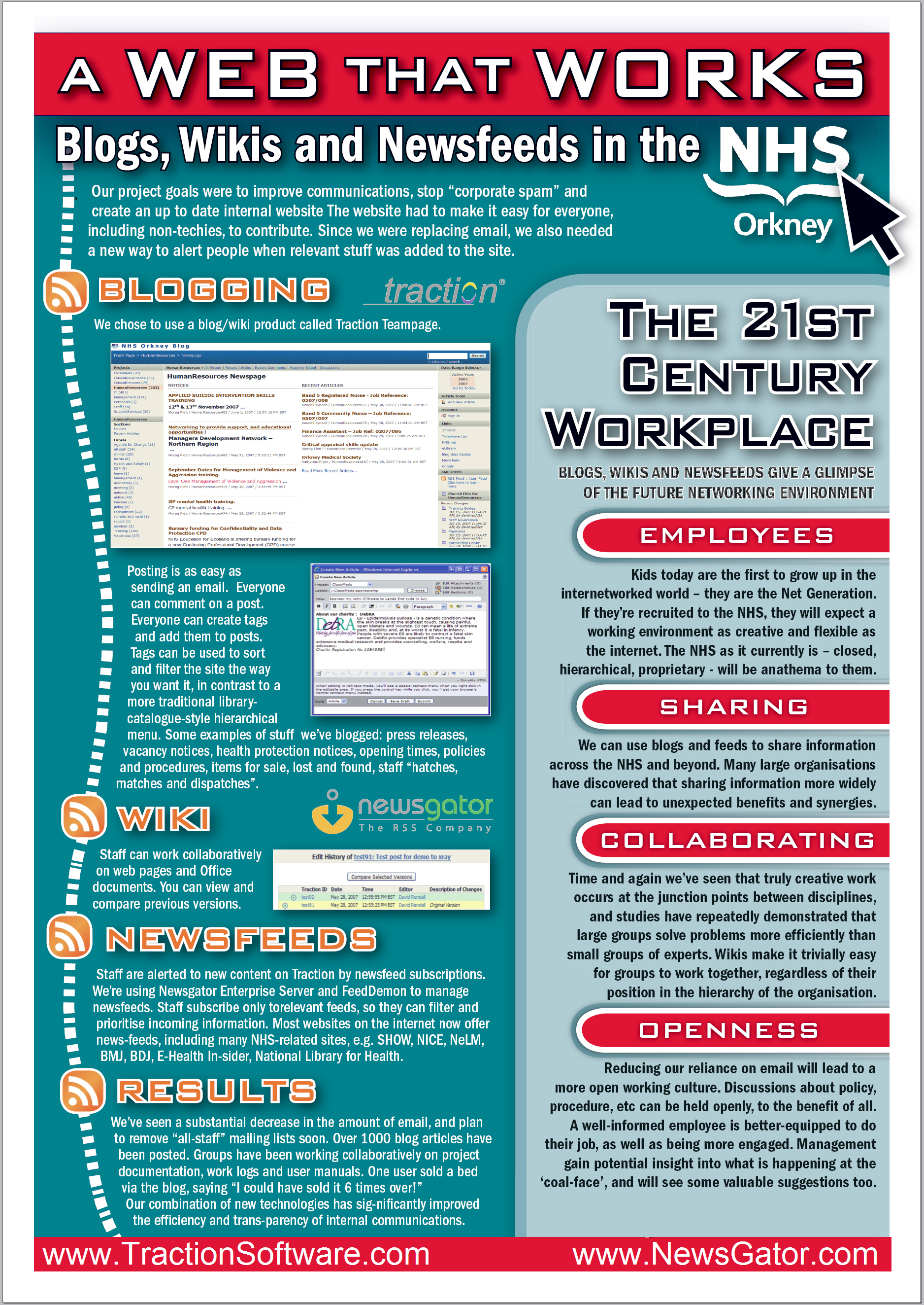 David Rendall, National Health Service Orkney created his A Web That Works blog to complement his poster presentation at the UK's National Health Service conference: Delivering Healthcare in the 21st Century, 11-12 Jun 2007, Glasgow UK. David co-authored a 30 July 2007 Intranet Journal article about his experience with Traction Software's Jordan Frank. Visit David's blog ! To download a full-size copy of David's poster (3.2MB .jpg) click here, posted with David's permission.
