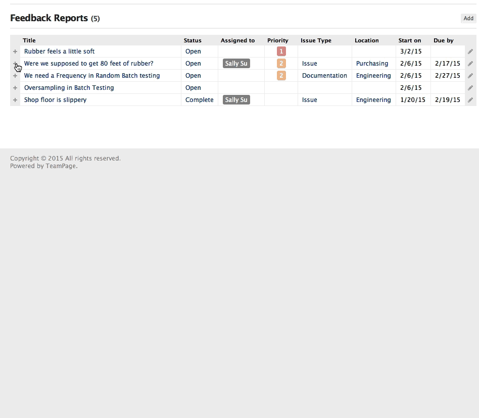 TeamPage Sections are user-defined summaries based on live, permission-aware queries that gather and filter articles, comments, projects, tasks, milestones and other objects specified using the TeamPage Section Editor. A Section Table shows this summary as a live table with rows that can be sorted on any column. Individual rows can be expanded inline. Section Tables can be defined and added to any TeamPage article using the rich text editor.