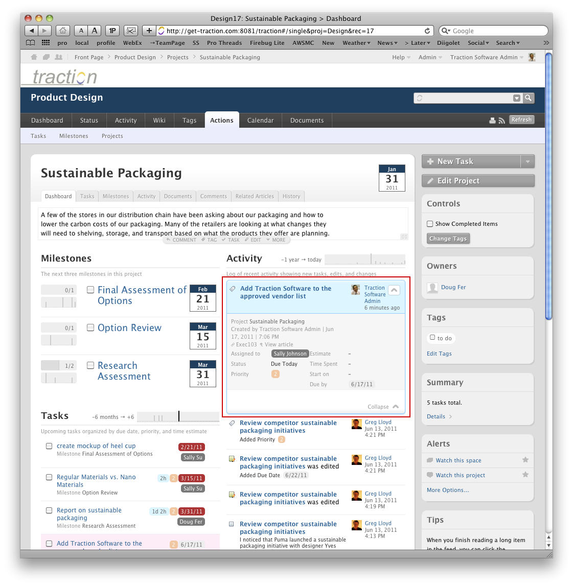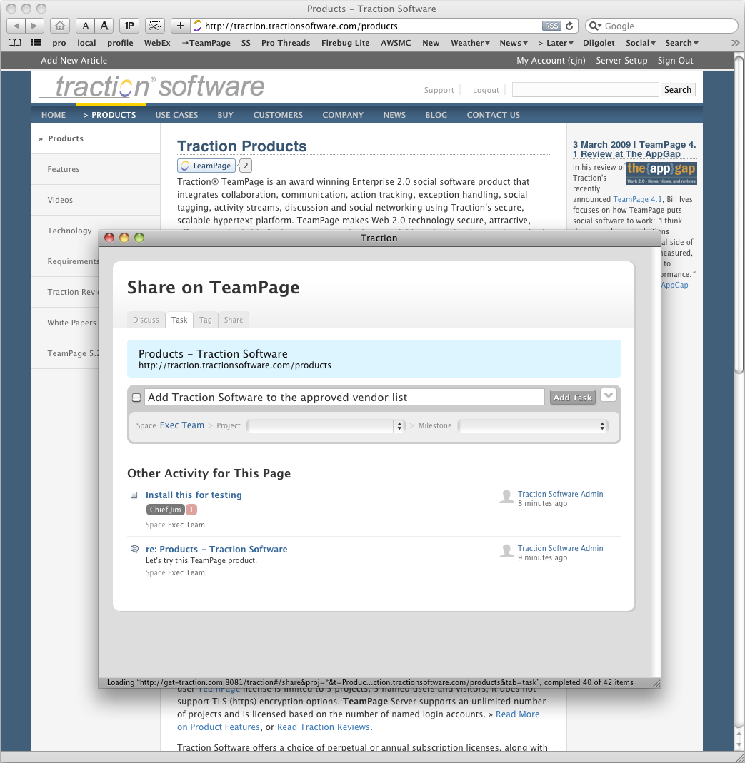 Traction TeamPage seamlessly integrates collaboration, personal profiles, action tracking, search, social networking and project dashboards, enabling people to work effectively with internal and external stakeholders across private and public spaces. Commercial and government organizations of every size use TeamPage to connect people working on plans, projects, research, case management, competitive intelligence, issue tracking, and social customer or supply chain management. Traction TeamPage customers have won 2010 Forrester Groundswell and 2011 Computerworld Laureate awards for effective collaboration, and are featured in the independent Feb 2011 Deloitte Social Software for Business Performance report showing measurable results including a 61 percent reduction in time required for compliance activities leveraging Traction TeamPage capabilities.