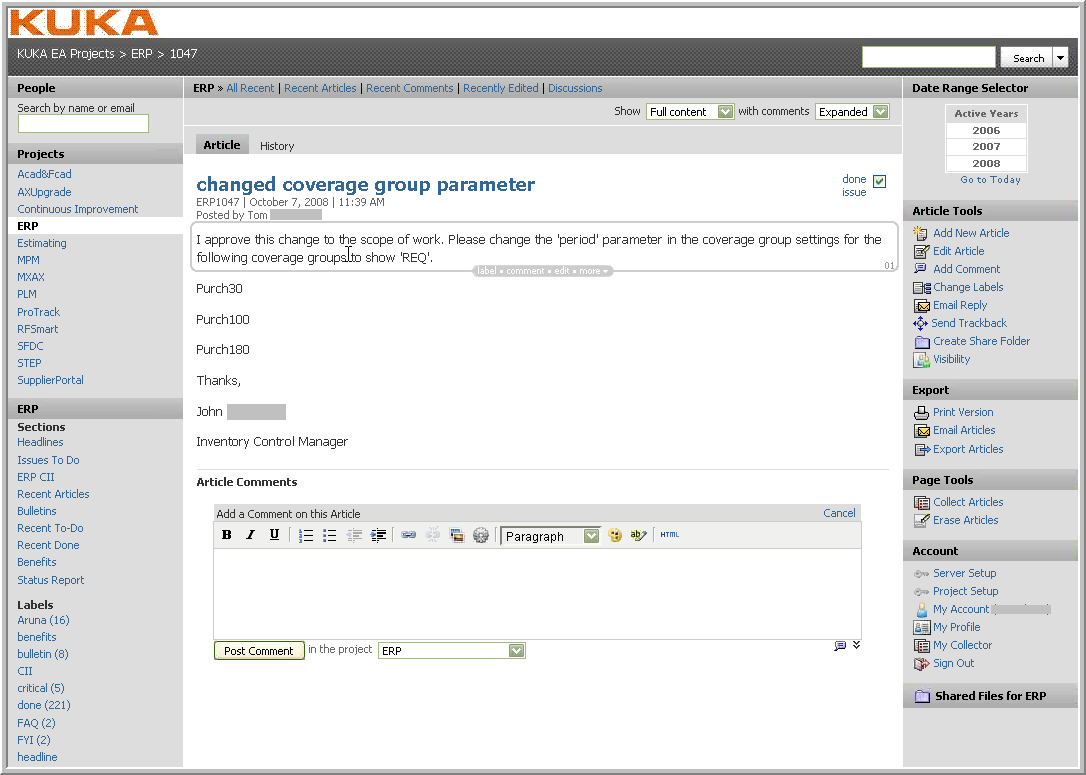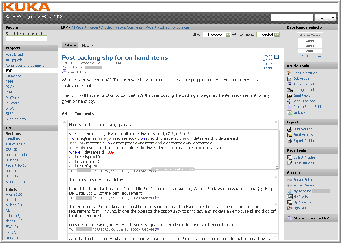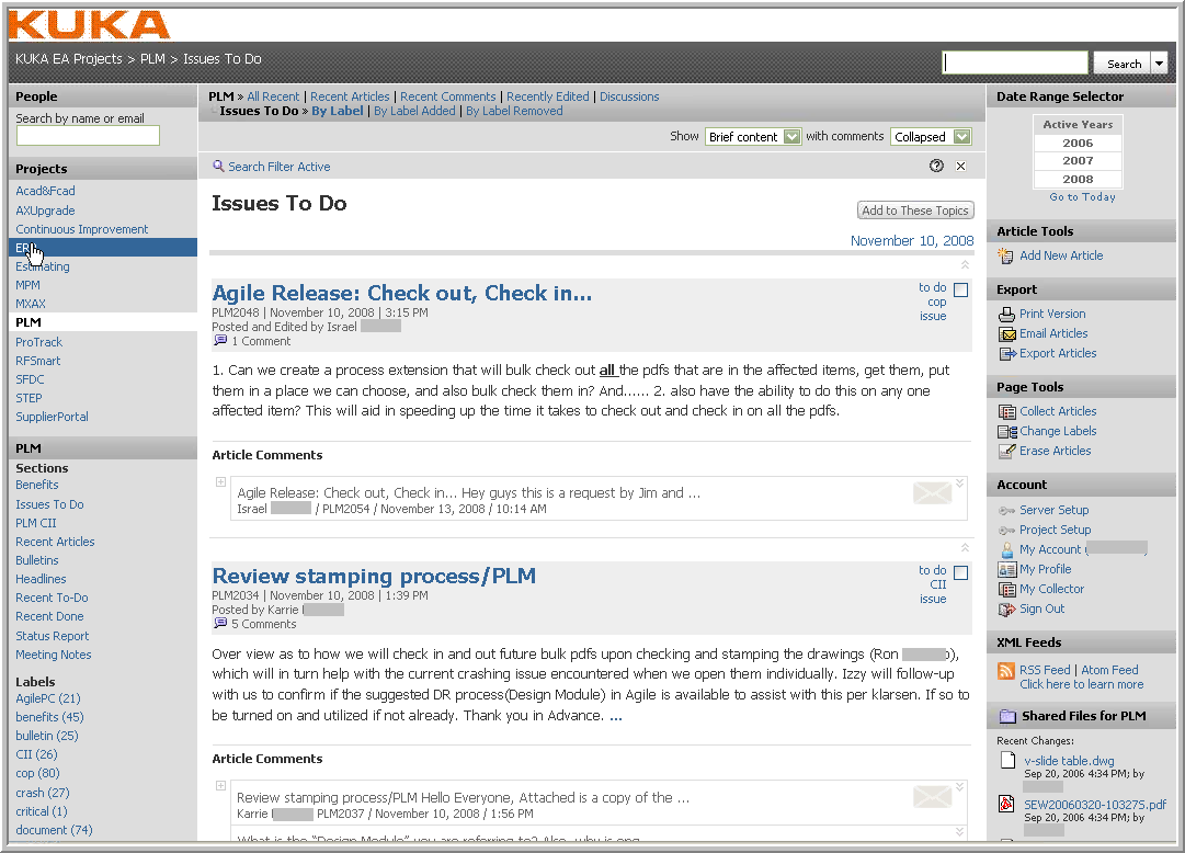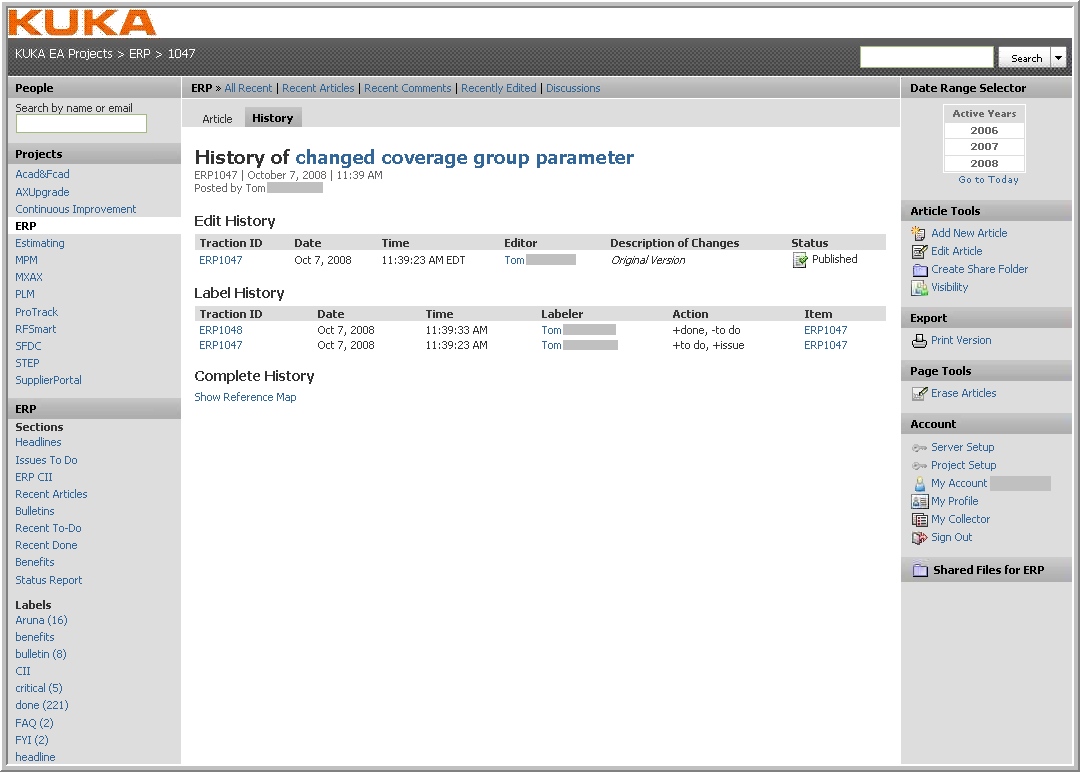 KUKA is one of the world's leading suppliers of robotics as well as plant and systems engineering. Their Enterprise Applications group deployed Traction® TeamPage in 2006 to support a process for collaborative Issue Tracking for their deployed enterprise information system.