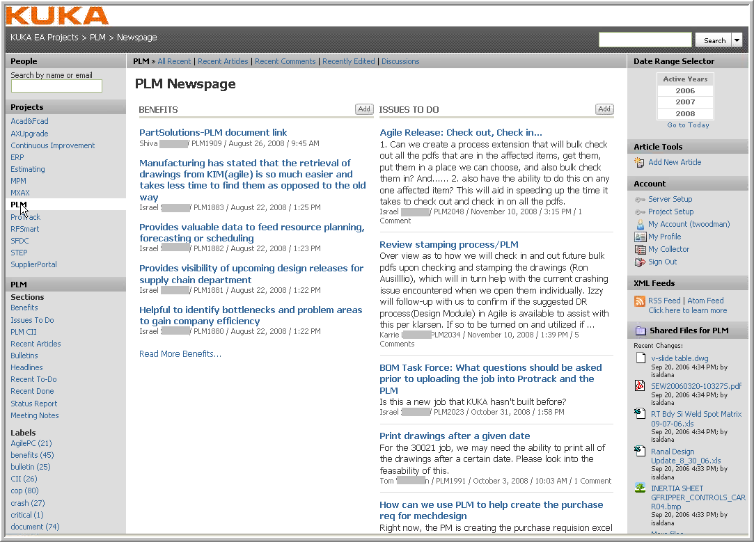 Below is an image of the PLM Project newspage, with emphasis on system benefits and a log of open issues.