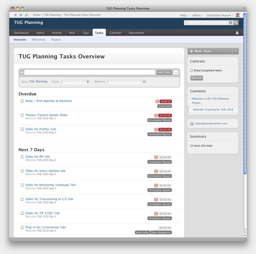 • Summary and navigation of tasks grouped by Milestone – a sharable date with a name