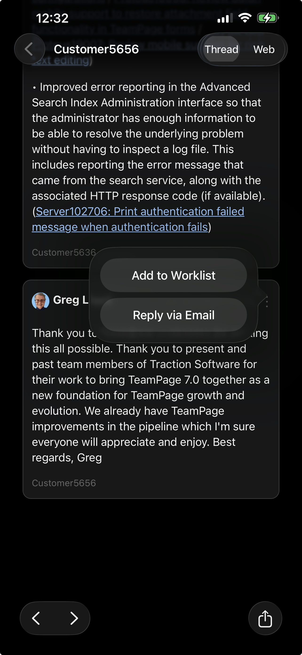 • Context menu lets you add an entry to your worklist or reply via email (incoming email support must be configured on your TeamPage server).